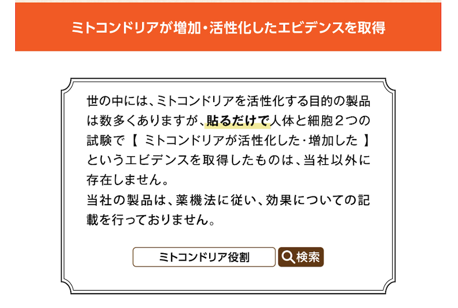 世の中には、ミトコンドリアを活性化する目的の製品は数多くありますが、貼るだけで人体と細胞2つの試験で、ミトコンドリアが“増加” “活性化”というエビデンスを取得した製品は、当社以外に存在しません。