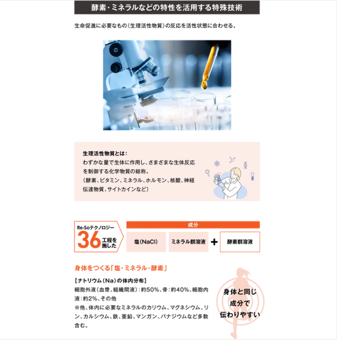 ・成分:塩(NaCI)、ミネラル群溶液+酵素群溶液。