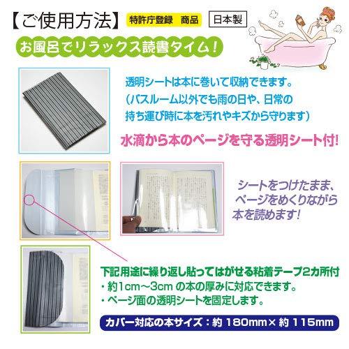 通常1-5営業日で発送:【製品特長】・お風呂でゆっくり半身浴しながら読書ができる! 通勤・通学時にもgood!・透明シートは本に巻いて収納できます。 (バスルーム以外でも雨の日や、日常の持ち運び時に本を汚れやキズから守ります。)・カバー対応の本サイズは新書、コミック単行本サイズで、約180×115mm。・約1~3cmの本の厚みに対応できます。・繰り返し貼ってはがせる粘着テープ2箇所付。ページ面の透明シートを固定します。