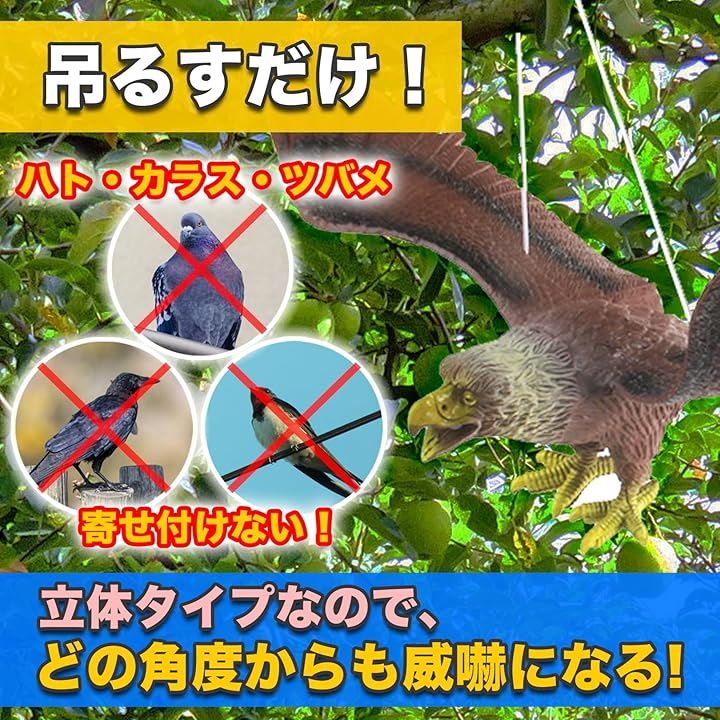 鳥よけセットは、鷹、鷲、鳶をつるすだけでカラス、ハト、ツバメ、スズメ、ムクドリなどの防鳥対策に。