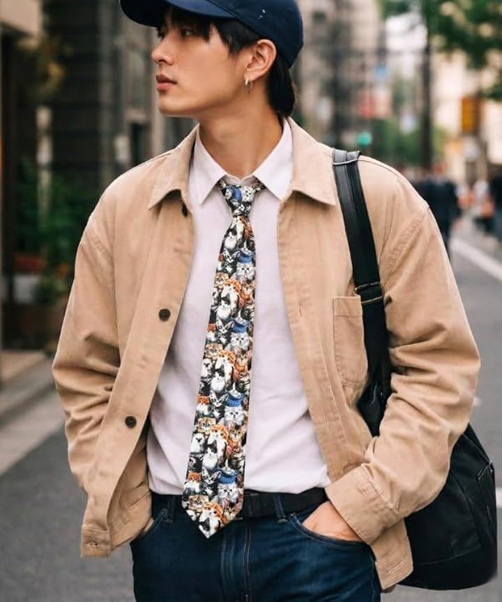 「猫デザイン」 様々な種類のリアルな猫たちがネクタイ全体に敷き詰められた、猫好きのためのデザイン。