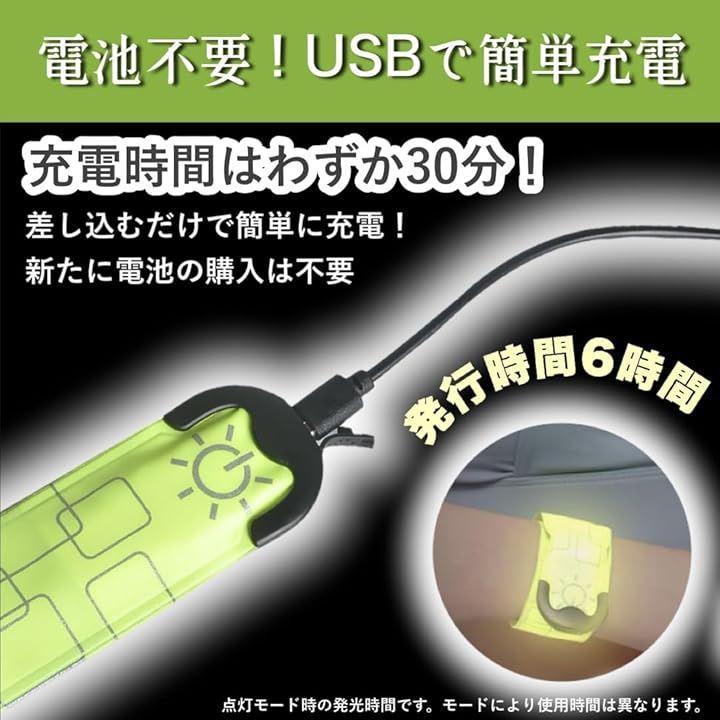 ・50m離れた場所からもしっかりと認識できる明るさ。 ・撥水性急に雨が降っても安心 ・約30gととっても軽量 ・夜間のランニングやサイクリング、ペットのお散歩など様々なシーンで大活躍。 「詳細」 サイズ:全長35.3cmx幅3.7cm 重量:約30g 材質:ナイロン、マンガン銅 充電方法:micro USB(Type-CまたはType-B) 充電時間:約30分 カラー:全6色 (レッド、イエロー、ブルー、ピンク、オレンジ、ホワイト) *イエローは発光時グリーンに変わります。