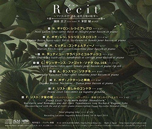 東京都交響楽団の首席ファゴット奏者、岡本正之のソロ・アルバム。タイトルの『Recit』(レチタティーヴォ)は、リサイタル等と同じ語源で“語る”を意味するフランス語。“弾く”“歌う”ではなく、音符で“語る”側面からファゴットの主要レパートリーの魅力を再発見しようと試みた意欲作。 (C)RS