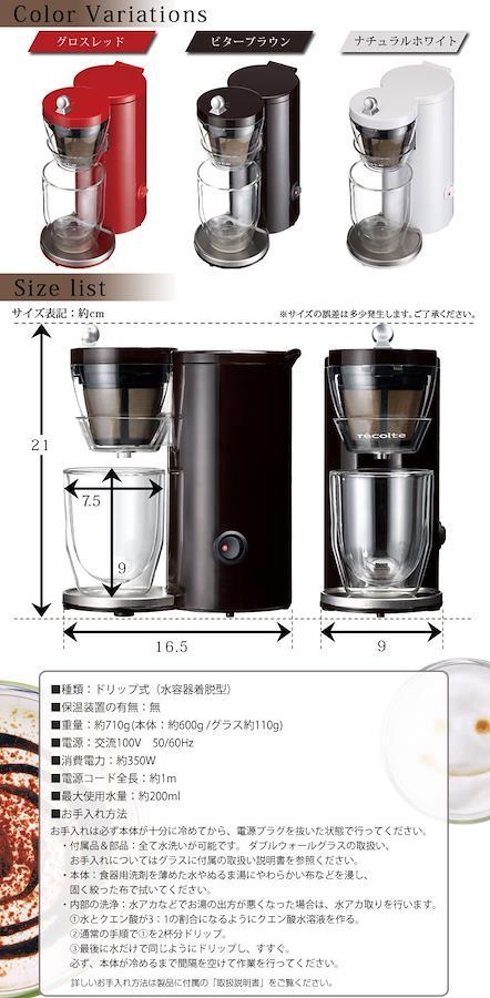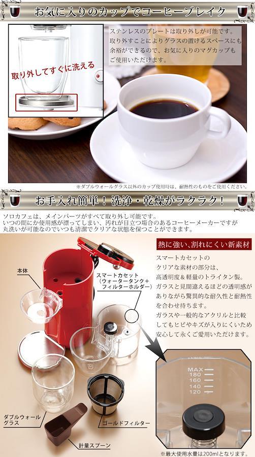 3営業日以内に発送≪新品未開封品≫:本体サイズ:幅9.0×奥行16.5×高さ21.0cm本体重量:710g(本体600g+グラス110g)本体素材:ABS樹脂/TRITAN樹脂 他、トレイ素材:ステンレス、グラス素材:耐熱ガラス原産国:中国電源:100v、50/60Hz消費電力:350w保証期間:1年付属品:専用ゴールドフィルター、ウォータータンク・フィルター一体型カセット、ダブルウォールグラス(耐熱ガラス)、計量スプーン(10g)容量:MAX200ml(お好みで調整できます)保温機能なし