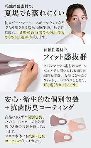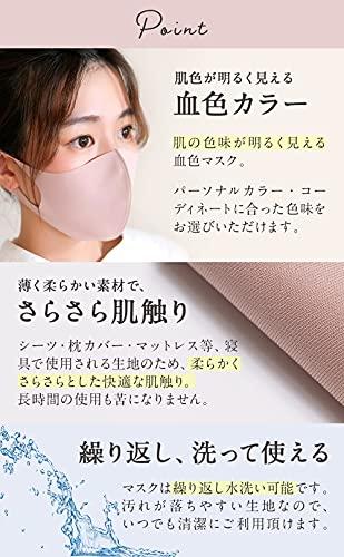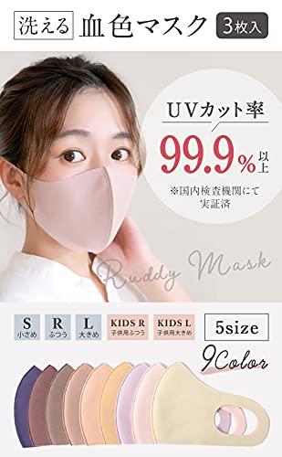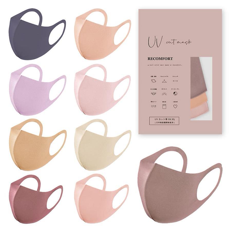 【日本の公的検査機関にて実証済み、紫外線カット率99%以上のUVカットマスク】紫外線を99%以上カットしてくれるUVカットマスク。その性能は日本の公的機関(一般財団法人カケンテストセンター)にて実証済みです。夏だけでなく秋冬も油断できない直射日光による皮膚の老化、損傷を防ぎます。 【寝具でも採用される生地で、さらさらの肌触り】マスクは高品質なスパンデックス製(ポリエステル95%、ポリウレタン5%)。寝具やスポーツウェアでも採用される肌触りの良いさらさら生地を使用しているので、着け心地がよく、触れた瞬間の心地よいさらさら感がたまりません。長時間の使用でも蒸れにくいスパンデックス生地を使用しており、オールシーズンご使用いただけます。 【肌色が明るく見える血色マスク】肌の色が明るく見える血色カラー。全9色+新色7色で、パーソナルカラー・コーディネートに合った色味をお選びいただけます。【紫外線カット率99%以上】日本の公的検査機関にて実証済み。紫外線を99%以上カットしてくれるUVカットマスク。夏だけでなく秋冬も油断できない直射日光による皮膚のダメージを防ぎます。【肌色が明るく見える血色マスク】肌の色が明るく見える血色カラー。全9色+新色7色で、パーソナルカラー・コーディネートに合った色味をお選びいただけます。【寝具でも採用される生地で、さらさらの肌触り】マスクは高品質なスパンデックス製(ポリエステル95%、ポリウレタン5%)。寝具で採用される肌触りの良いさらさら生地を使用しているので、着け心地がよく、触れた瞬間の心地よいさらさら感がたまりません。長時間の使用でも蒸れにくいスパンデックス生地を使用しており、オールシーズンご使用いただけます。新品のマスクは開封直後に素材特有のにおいがする場合がございます。においが気になる場合は、ご使用前に中性洗剤で軽く手洗いいただきますとにおいが取れます。【伸縮性素材でフィット感抜群】マスクは3D立体構造で、どんなフェイスラインにもぴったりフィットします。通常マスクのようなゴム紐ではなく、柔らかく伸縮性抜群なスパンデックスの幅広布なので、長時間の装着でも耳が痛くなりにくいです。顔の凹凸にしっかり密着したシルエットで、小顔効果も期待できます。【洗って繰り返し使用可能】マスクは繰り返し水洗い可能です。汚れが落ちやすい生地なので、いつでも清潔にご利用頂けます。【安心・衛生的な個別包装】商品は1枚ずつ個別包装したのち、zip袋と外装袋で3重の包装を施しております。