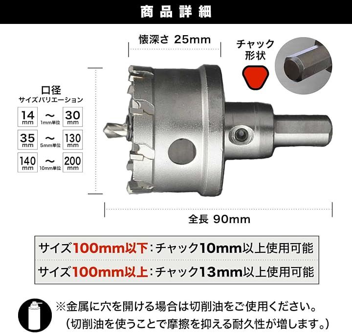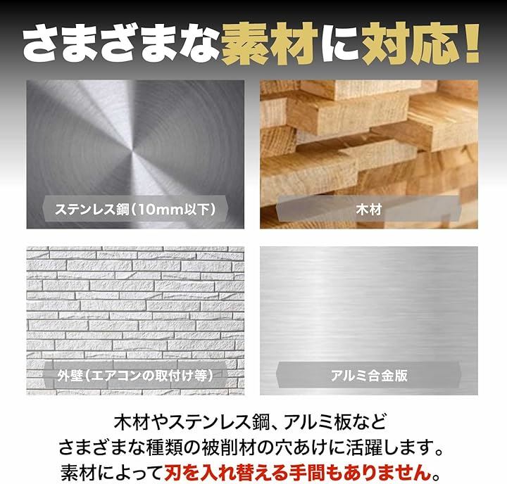 「被削材」ステンレス板 (10mm以下)、鋼板、鉄 板 用、アルミ 等 合金板、木材、外壁、(エアコン・換気扇の取付け等)、アクリル、発泡スチロール、薄いモルタル、薄いコンクリート パネル ボード、人口大理石など *U字側溝等の二次製品にはお使いいただけません。