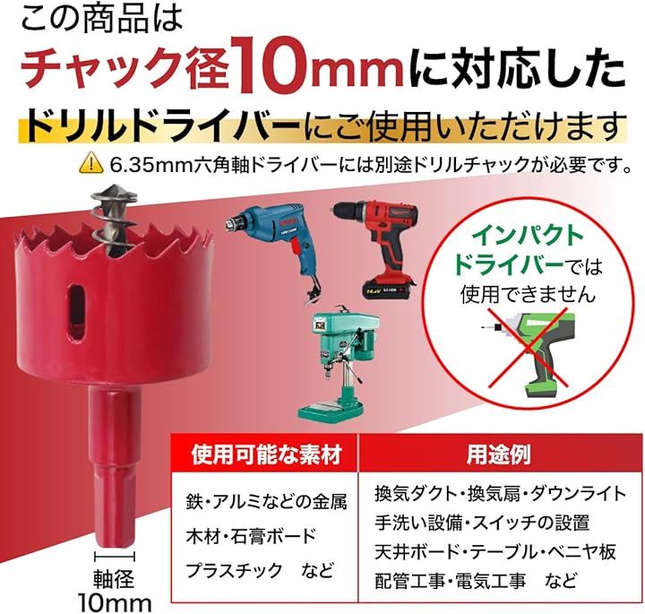 「必ずお読みください」インパクトドライバー、振動ドリル使用不可 、 3本爪チャック用 チャック径:10mmドリルが装着できるもの(6.35mm六角軸には不可)