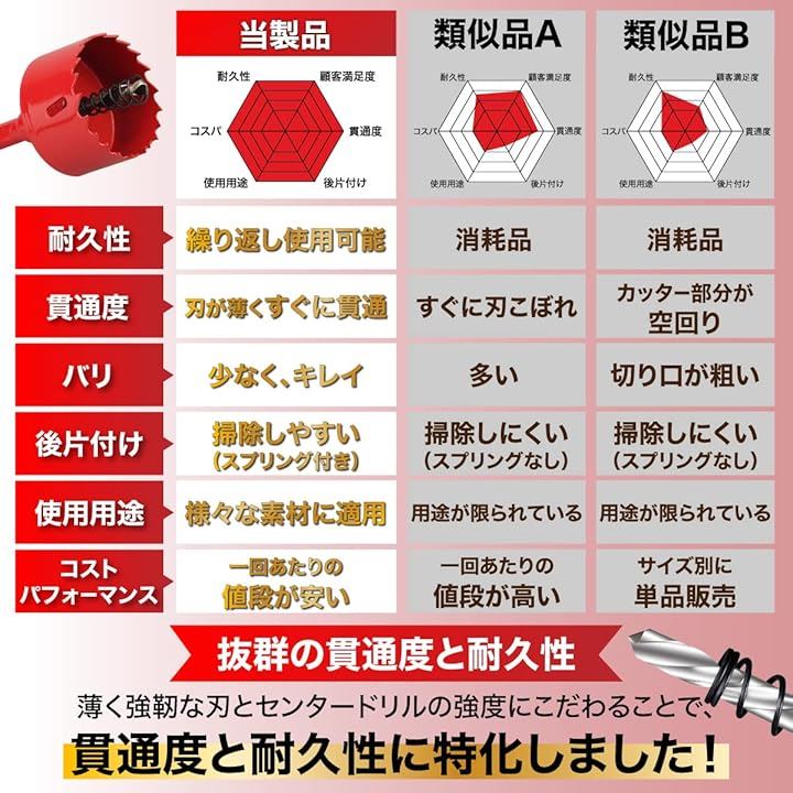「スプリング付きセンタードリル」センタードリルが付いているから初心者の方でも位置決めがカンタン。狙った場所に簡単に穴あけが出来ます。スプリングも付いているため掘削などにも適しています。