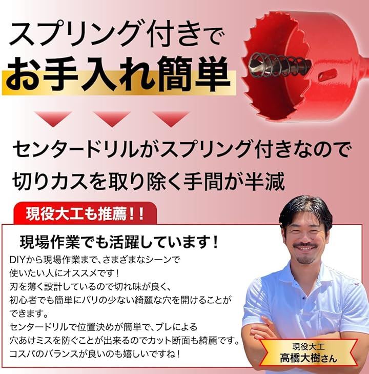 「スプリング付きセンタードリル」センタードリルが付いているから初心者の方でも位置決めがカンタン。狙った場所に簡単に穴あけが出来ます。スプリングも付いているため掘削などにも適しています。