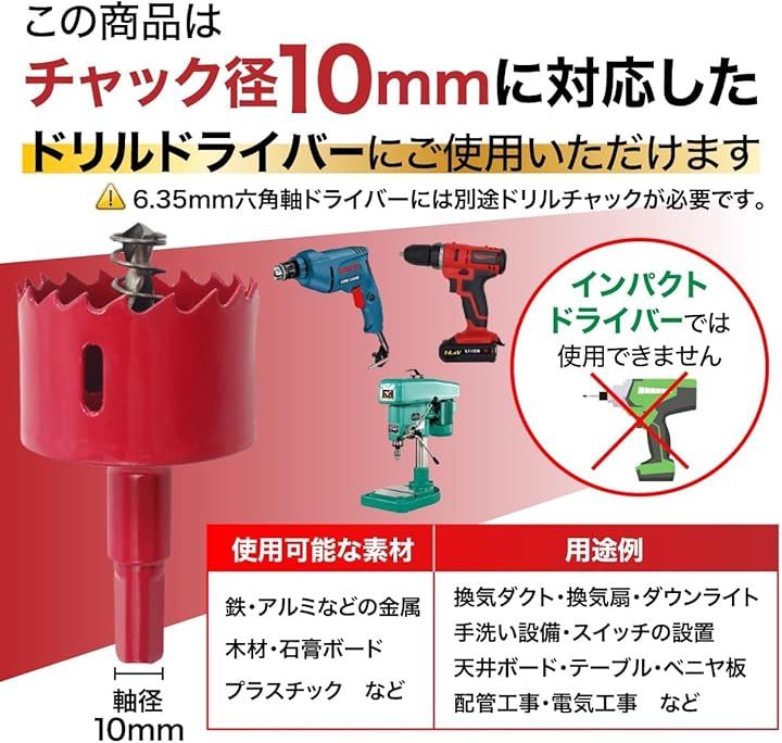 「必ずお読みください」インパクトドライバー、振動ドリル使用不可 、 3本爪チャック用 チャック径:10mmドリルが装着できるもの(6.35mm六角軸には不可)