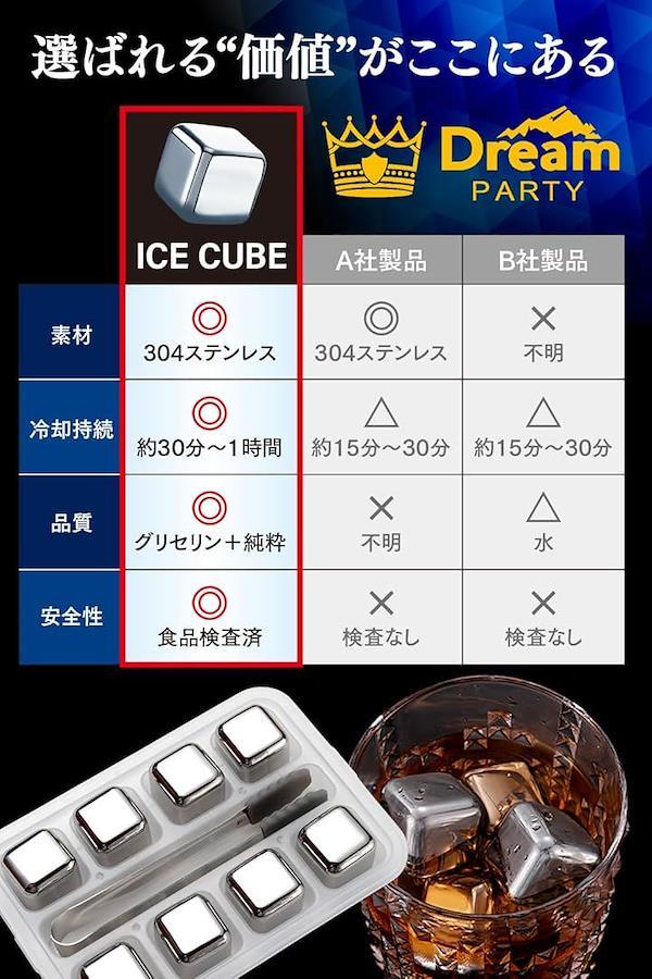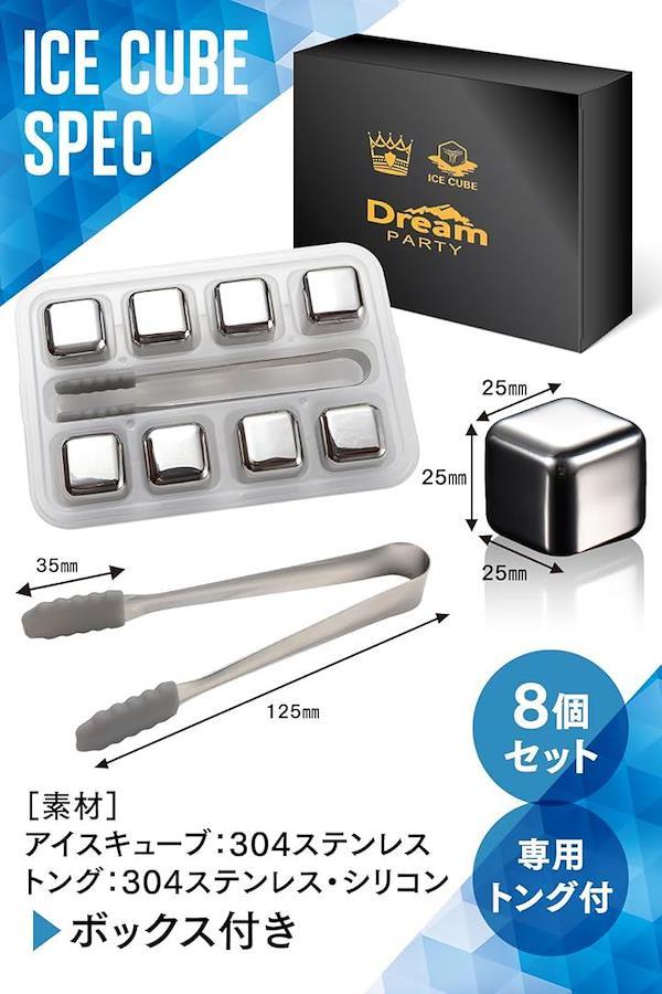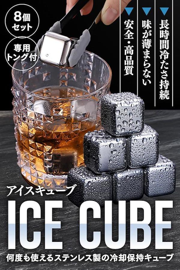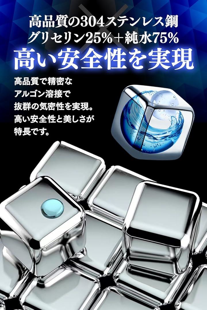 「安全・安心・高品質」食品検査済*アイスキューブ8個セット/専用トング付き/専用ボックス入り*素材:304ステンレス鋼・シリコン*アイスキューブ:25mmx25mmx25mm*トング:長さ125mm*グリセリン25%+純水75%