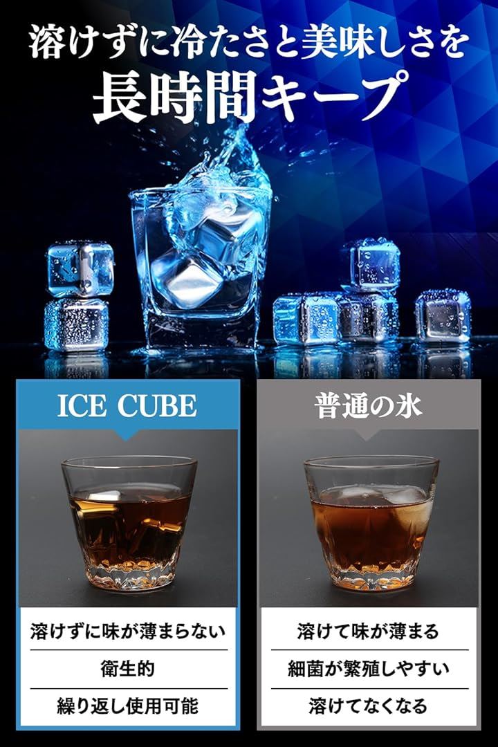 「飲み物が薄くならない。」カクテル・ウイスキー・焼酎・ジュース・アイスコーヒーなど時間がたっても濃い味のまま。氷のように解けて味を薄めないから、コールドドリンクが一層美味しく。