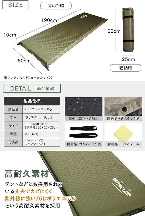 「商品詳細」〇ブランド:NATURE LAND 〇展開サイズ:190x60x10cm(ウレタンフォーム),収納サイズ:60x25x25cm,重量:約3.4kg 〇素材:(外生地)75Dポリエステル,(内部素材)21Dウレタンフォーム *ご利用時の注意事項:出荷時に機械で圧縮処理をしているため、初回使用時はウレタン全体に空気が行き渡らず自動で膨らまないor10cmまで膨らまないことがあります。