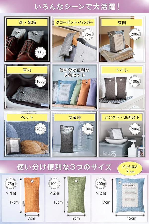 小さいサイズは 靴 消臭 、大きいサイズは 下駄箱 消臭 などに使い分けが便利で、ハトメ加工により ハンガー に吊るすこともできるので、 クローゼット 消臭 や クローゼット 除湿 にも効果を発揮します。