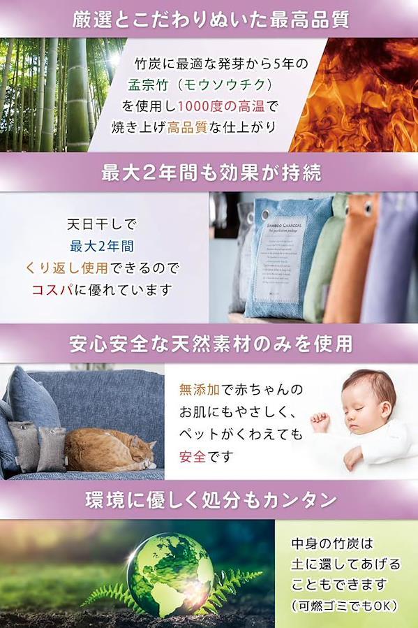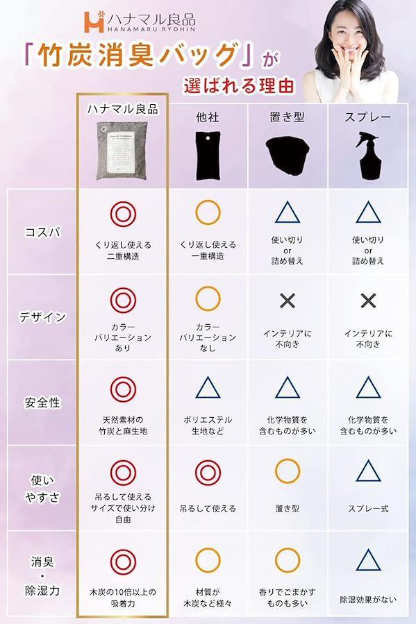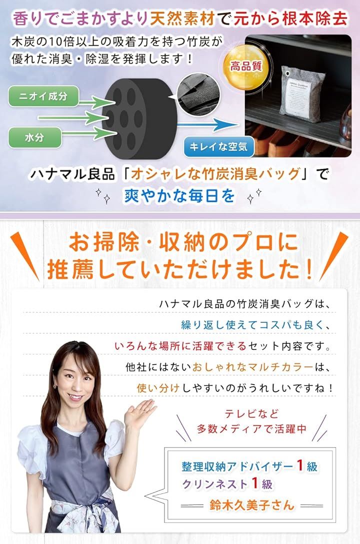 「消臭・除湿・抗菌 ニオイのモトから根本除去」 ハナマル良品の竹炭バッグは、 消臭 脱臭 除湿 効果を発揮するため、厳選された高品質の優れた竹炭のみを使用。木炭や備長炭の10倍の吸着力でニオイのモトから根本除去。天然の竹炭ですので、香でごまかす 消臭剤 とは違い、 無臭 でイヤなニオイと混ざることなく自然で爽やかな環境でご使用いただけます。