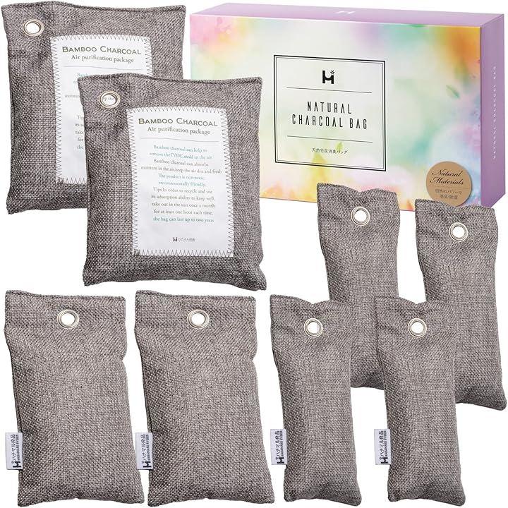 「ハナマル良品 消臭 脱臭 除湿 竹炭 バッグ 8個セット内容」(1)竹炭バッグ「75gx4個」(サイズ:約縦17cmx幅7cmx厚さ3cm/個)・「100gx2個」(サイズ:約縦18cmx幅9cmx厚さ3cm/個)・「200gx2個」(サイズ:約縦17cmx幅15cmx厚さ3cm/個)、(2)説明書(脱臭・除湿の効果アップ実践法付き)