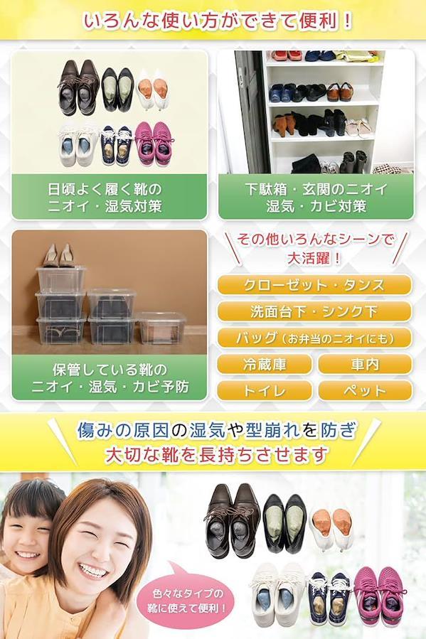 靴 乾燥剤 消臭剤 以外でも、靴箱 下駄箱 タンス クローゼット 衣装ケース お弁当などを入れたバッグ スーツケース 車 ペット トイレ 洗面台下 シンク下 冷蔵庫 ロッカー などにのさまざまな気になる場所に効果を発揮し、ポンと置くだけで使い方も超カンタン。