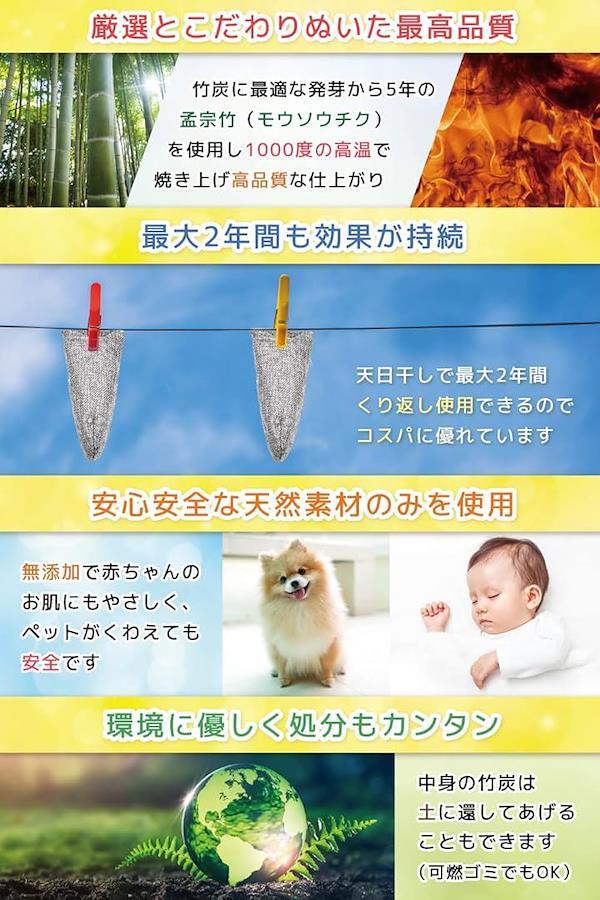 「消臭・除湿・抗菌 ニオイのモトから根本除去」 ハナマル良品の竹炭バッグは、 消臭 脱臭 除湿 効果を発揮するため、厳選された高品質の優れた竹炭のみを使用。木炭や備長炭の10倍の吸着力でニオイのモトから根本除去。天然の竹炭ですので、香でごまかす 消臭剤 とは違い、 無臭 でイヤなニオイと混ざることなく自然で爽やかな環境でご使用いただけます。
