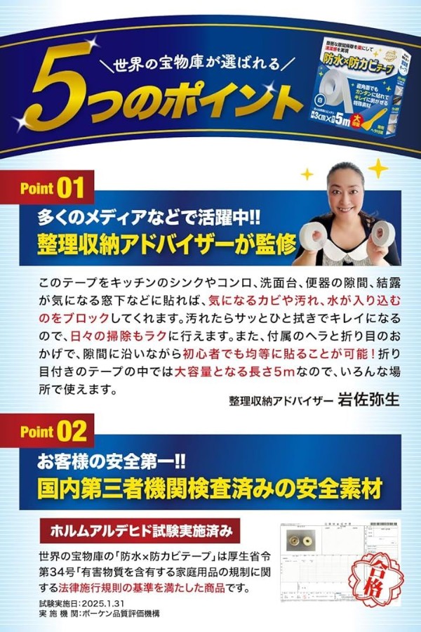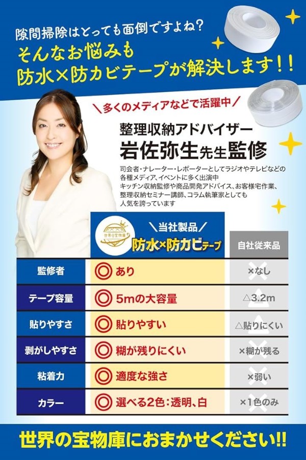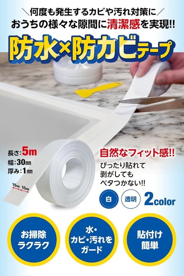 「隙間をしっかりブロック」直角面でも簡単に貼り付けできてピッタリ・キレイな仕上がりに。 隙間に入り込む汚れ・カビ・水分・油をしっかりブロックし、おウチの様々な隙間を綺麗に保ちます。