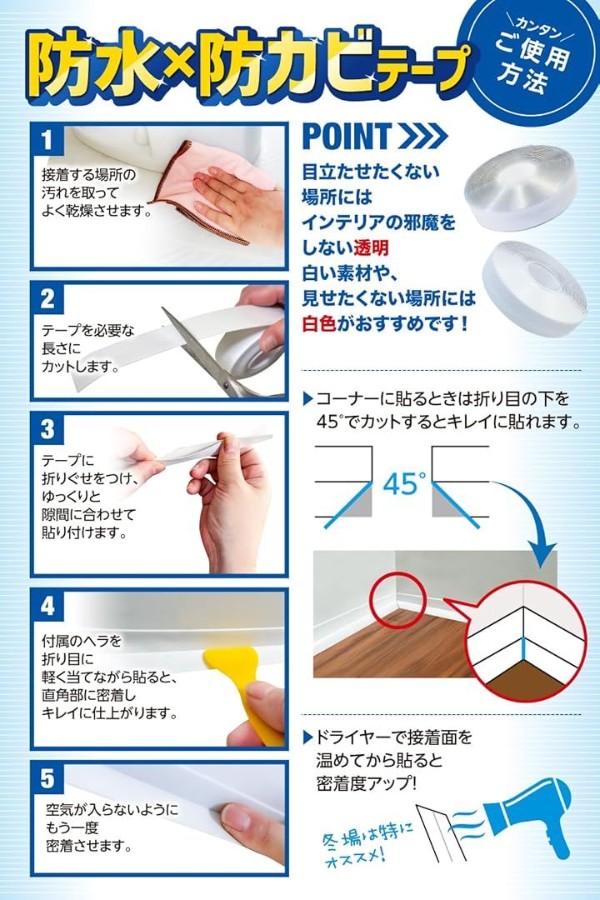 「隙間をしっかりブロック」直角面でも簡単に貼り付けできてピッタリ・キレイな仕上がりに。 隙間に入り込む汚れ・カビ・水分・油をしっかりブロックし、おウチの様々な隙間を綺麗に保ちます。