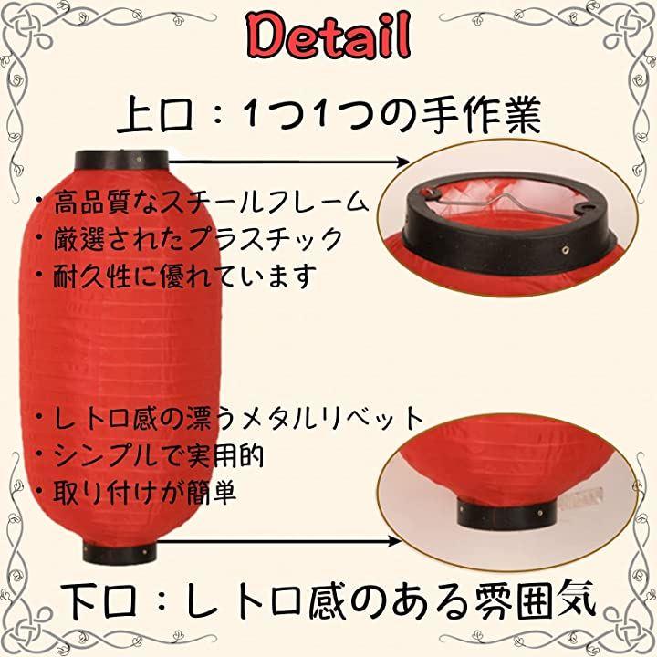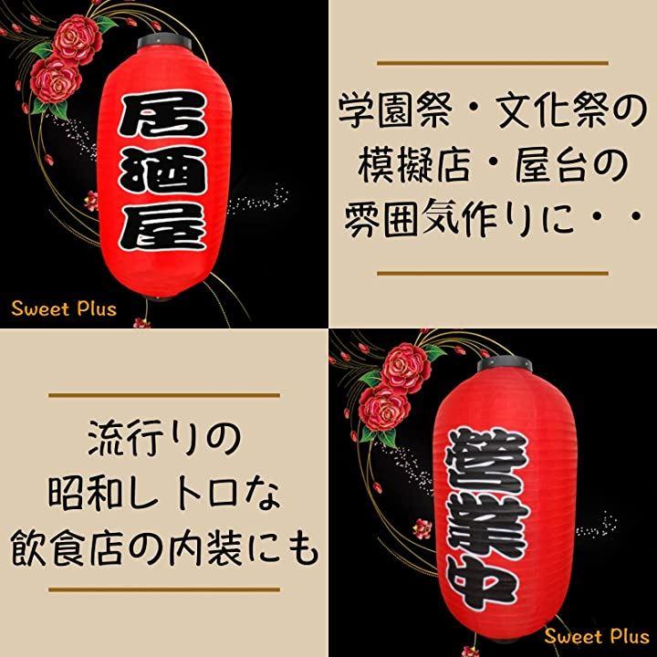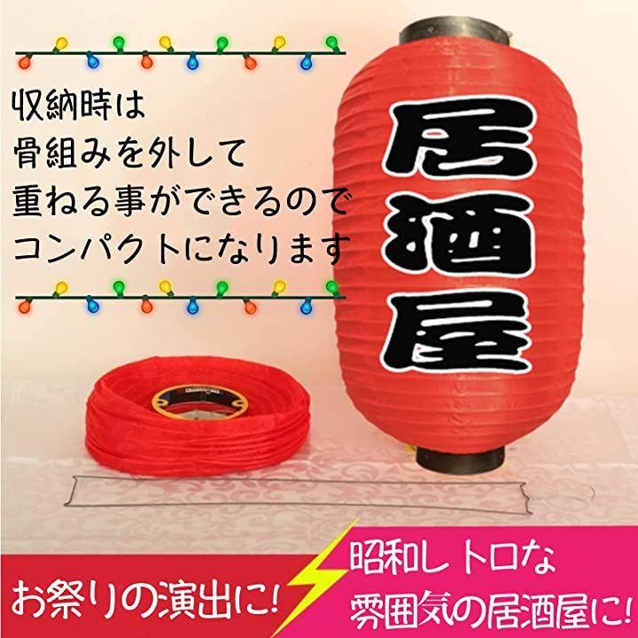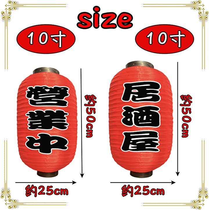・《サイズ》10寸 直径:約25cm / 高さ:約50cm ・12寸 直径:約30cm / 高さ:約55cm 《セット内容》提灯:居酒屋・営業中 / 営業中x2個(*金具x2本 / 吊るしフックx2個) *紙製品ですので内側に電球などを設置してお使いになる場合は十分に注意してお使い下さい。