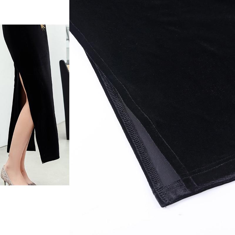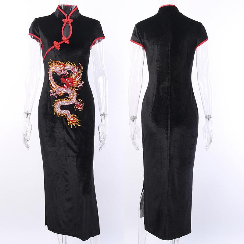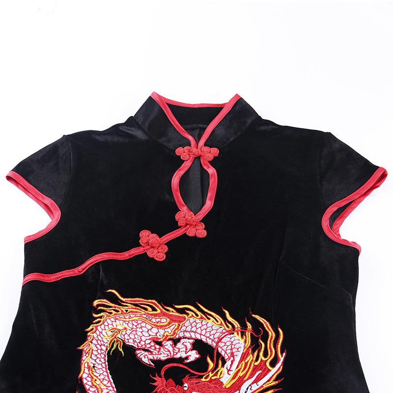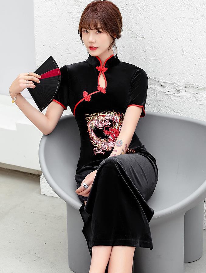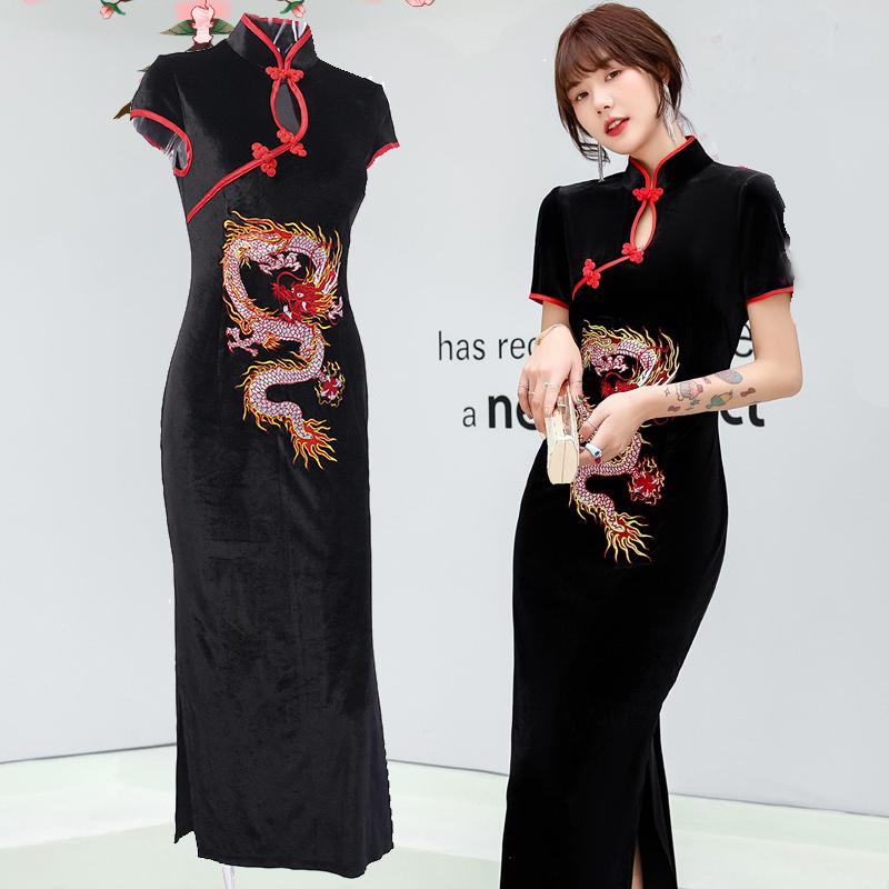 ししゅうの龍柄、ネックのデザインが特徴的、光沢感あり、高級感が溢れるベロア生地の上質なチャイナドレス!!