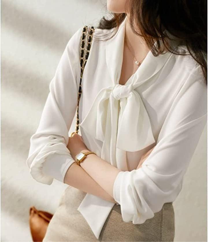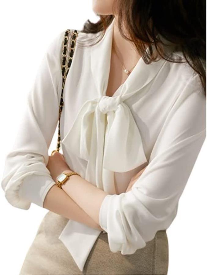 上品で大人可愛い、フォーマルでもカジュアルでも使える、キレイめ長袖リボンのブラウスシャツ。
