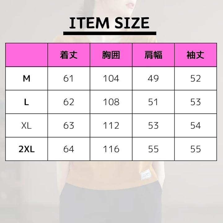 「サイズ」 Mサイズ:着丈61cm, 肩幅49cm, 胸囲104cm, 袖丈52cm Lサイズ:着丈62cm, 肩幅51cm, 胸囲108cm, 袖丈53cm XLサイズ:着丈63cm, 肩幅53cm, 胸囲112cm, 袖丈54cm 2XLサイズ:着丈64cm, 肩幅55cm, 胸囲116cm, 袖丈55cm
