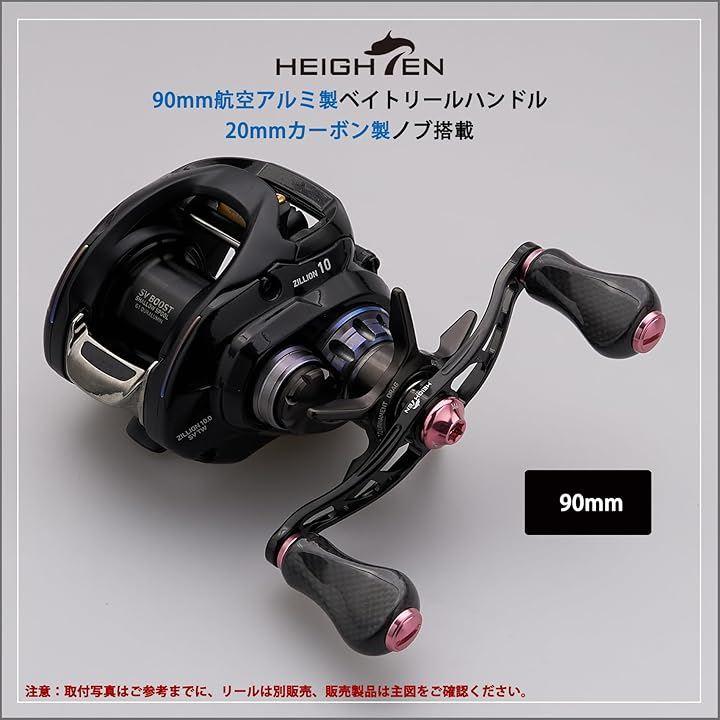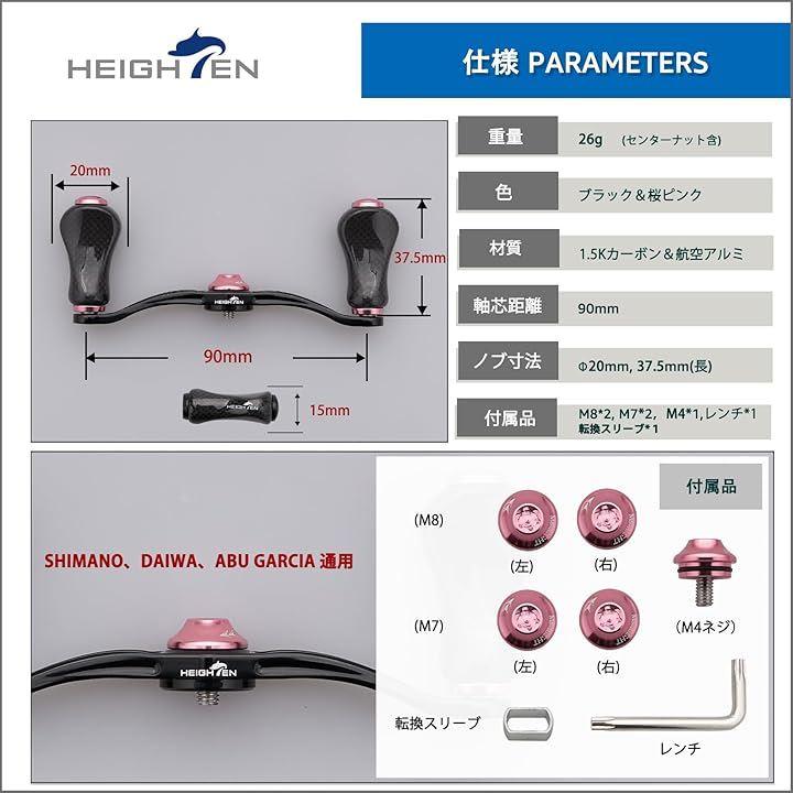 「サイズ」ハンドル軸心距離90mm、ノブ直径20mm/21mm 「総重」26g/27g「素材」70航空アルミ、1.5Kカーボン。
