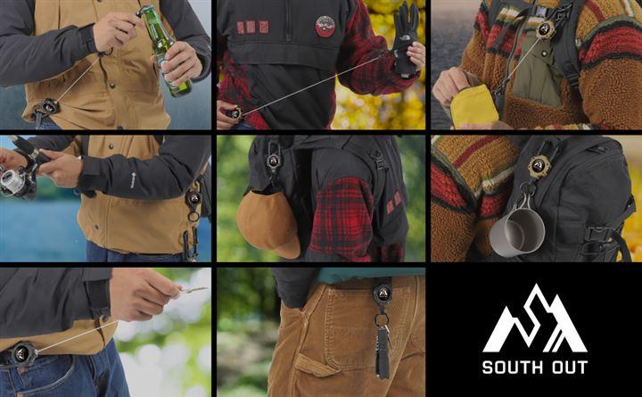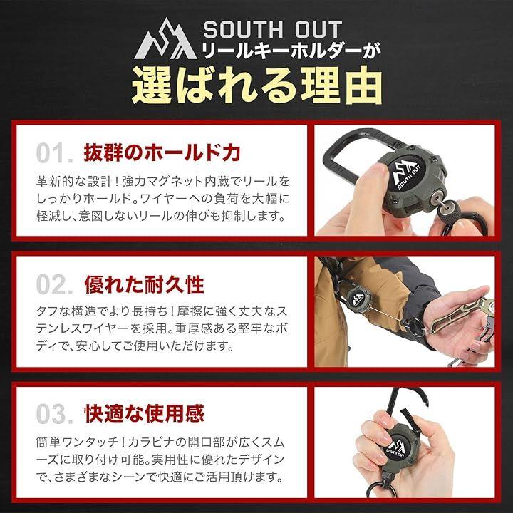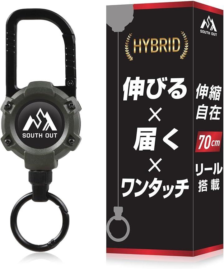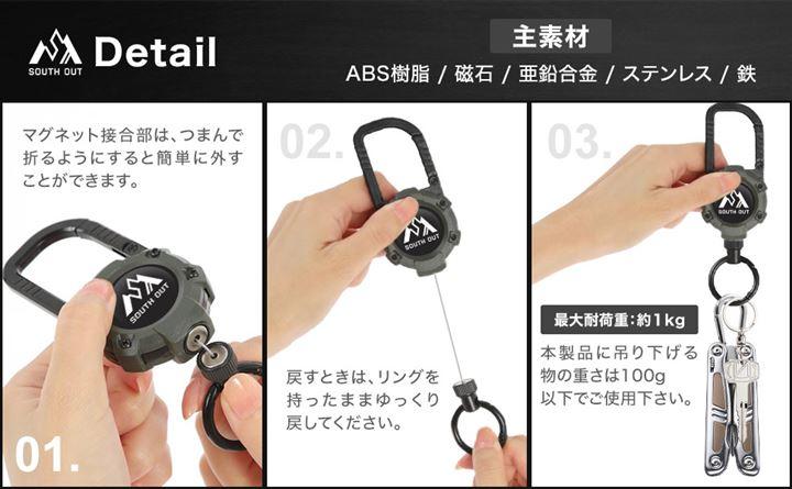 「伸びる。届く。ワンタッチ。」伸縮自在な約70cmワイヤーリール搭載で必要な場所まで伸びる。可動部が360°回転する抜群の取り回しで必要な場所まで届く。上下カラビナ仕様で着脱がお手軽ワンタッチ。