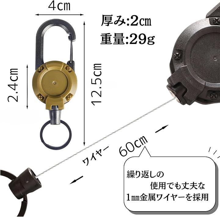 約60cm伸びるワイヤーは、丈夫な金属を使用しており、繰り返しの使用でもワイヤーが切れにくいキーリールです。