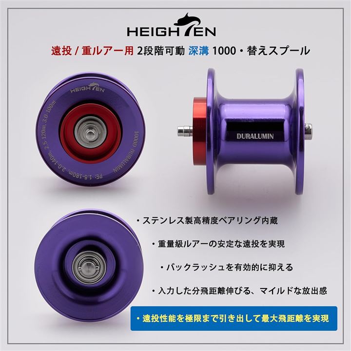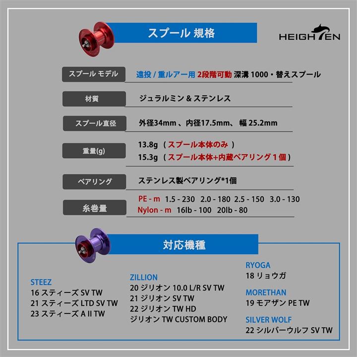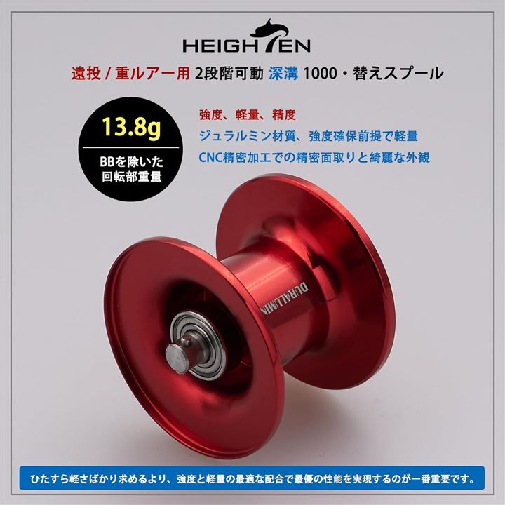 「寸法」重量:13.8g (スプール本体) / 15.3g ( スプール本体 + 内蔵ベアリング1個 )、材質:本体:ジュラルミン / ベアリング:ステンレス製のベアリング。