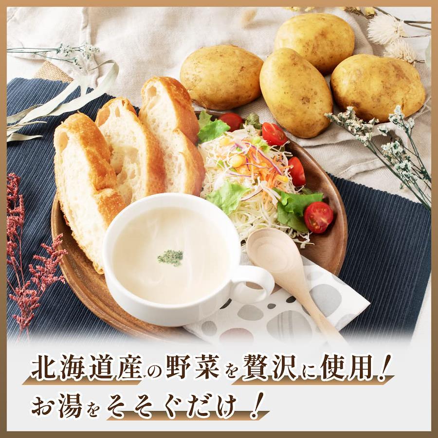 【内容量】1食(20g)×10食セット【原材料】澱粉(北海道製造)、クリーミングパウダー、ポテトパウダー(インカのめざめ)、砂糖、粉あめ、食塩、ぶどう糖、粉末植物油脂、バターミルクパウダー、チーズパウダー、練乳パウダー、脱脂粉乳、玉ねぎ、小麦粉、香辛料、うきみ(パセリ)/調味料(アミノ酸等)、(一部に乳成分・小麦・大豆を含む)【栄養成分表示】1食分(20g)当たり:熱量 78kcal、たんぱく質 1.0g、脂質 1.0g、炭水化物 16.0g、食塩相当量 1.3g【原産国名】日本【お召し上がり方】(1)1袋の中身をカップに入れます。 (2)熱湯約150mlを注ぎ、すぐに15秒ほどかき混ぜて下さい。 (3)お湯を注いでから約1分ででき上がりです。【保存方法】直射日光、高温・多湿を避けて保存してください。【使用上の注意】●内袋を開封後はできるだけお早めにお召上がり下さい。 ●調理時、飲食時の熱湯によるやけどには充分ご注意下さい。 ●内袋の切り口で手など切らないようにご注意下さい。 ●稀に内袋が切れにくい物がございます。その際はハサミで切って開けてください。【重要】メーカーによる商品リニューアルに伴いパッケージ(内容量も含む)変更が行われた場合、新パッケージでお届け致します事ご了承願います。