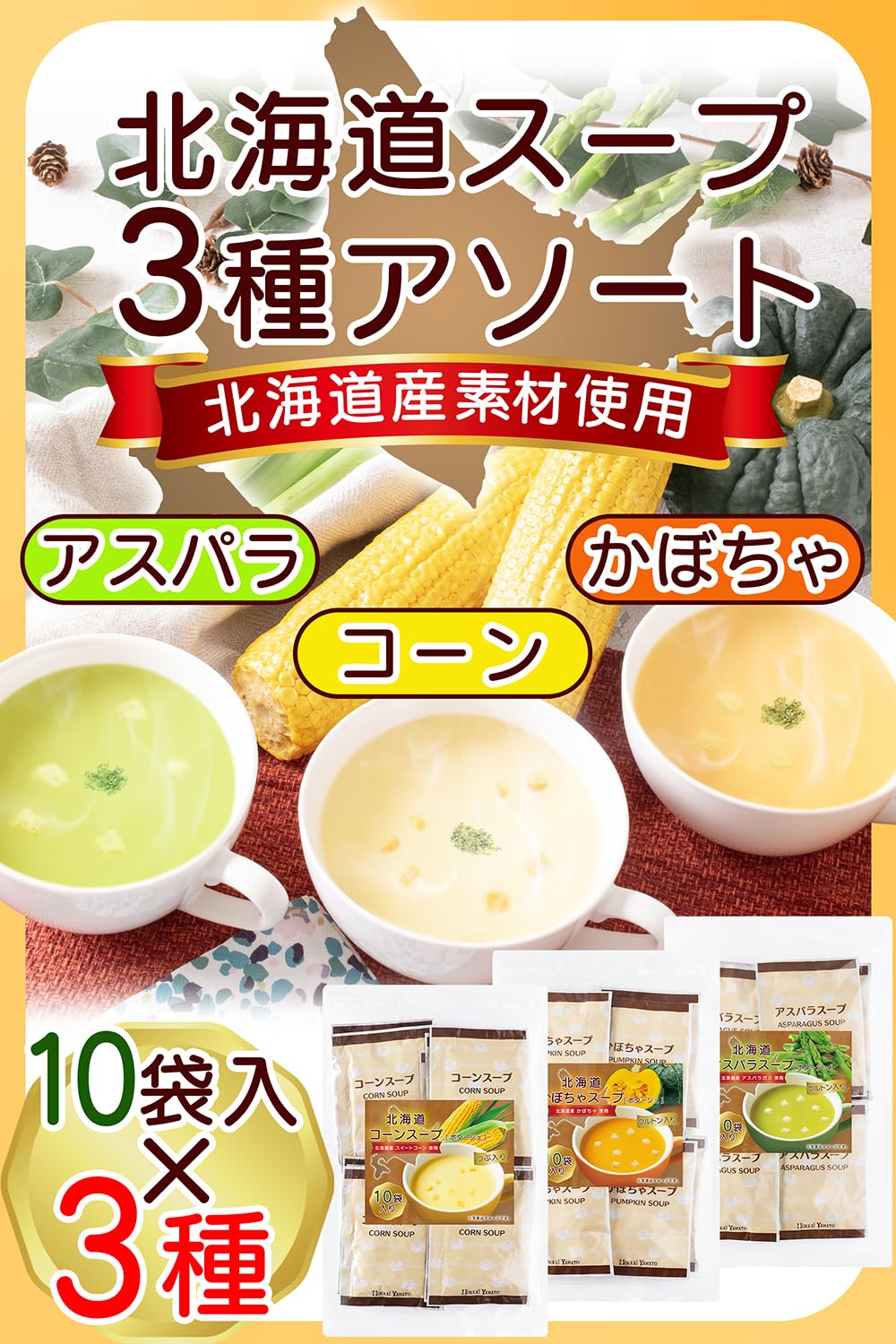 【内容量】各10食ずつ 計30食セット【原材料】●かぼちゃスープ:かぼちゃパウダー(北海道製造)、澱粉、砂糖、クリーミングパウダー、食塩、ぶどう糖、粉末植物油脂、バターミルクパウダー、チーズパウダー、粉あめ、練乳パウダー、脱脂粉乳、玉ねぎ、小麦粉、香辛料、うきみ(クルトン)/調味料(アミノ酸等)、(一部に乳成分・小麦・大豆を含む)●アスパラスープ:クリーミングパウダー(国内製造)、スイートコーンパウダー、アスパラガスパウダー、澱粉、砂糖、粉あめ、食塩、粉末植物油脂、ぶどう糖、チーズパウダー、バターミルクパウダー、練乳パウダー、脱脂粉乳、玉ねぎ、小麦粉、たん白加水分解物、香辛料、うきみ(クルトン)/調味料(アミノ酸等)、増粘剤(キサンタンガム)、着色料(β-カロチン)、(一部に乳成分・小麦・大豆を含む)●コーンスープ:クリーミングパウダー(国内製造)、スイートコーンパウダー、澱粉、砂糖、ぶどう糖、粉あめ、食塩、粉末植物油脂、バターミルクパウダー、チーズパウダー、練乳パウダー、脱脂粉乳、玉ねぎ、たん白加水分解物、小麦粉、香辛料、うきみ(コーン)/調味料(アミノ酸等)、増粘剤(キサンタンガム)、着色料(β-カロチン)、香料、(一部に乳成分・小麦・大豆を含む)【栄養成分表示】●かぼちゃスープ 1食分(16.5g)当たり:熱量 65kcal、たんぱく質 0.8g、脂質 1.0g、炭水化物 13.2g、食塩相当量 1.1g ●アスパラスープ 1食分(16.5g)当たり:熱量 66kcal、たんぱく質 1.0g、脂質 1.1g、炭水化物 13.1g、食塩相当量 1.0g ●コーンスープ 1食分(16.5g)当たり:熱量 66kcal、たんぱく質 1.0g、脂質 1.2g、炭水化物 13.0g、食塩相当量 0.9g【原産国名】日本【お召し上がり方】(1)1袋の中身をカップに入れます。 (2)熱湯約150mlを注ぎ、すぐに15秒ほどかき混ぜて下さい。 (3)お湯を注いでから約1分ででき上がりです。【保存方法】直射日光、高温・多湿を避けて保存してください。【使用上の注意】●内袋を開封後はできるだけお早めにお召上がり下さい。 ●調理時、飲食時の熱湯によるやけどには充分ご注意下さい。 ●内袋の切り口で手など切らないようにご注意下さい。 ●稀に内袋が切れにくい物がございます。その際はハサミで切って開けてください。【重要】メーカーによる商品リニューアルに伴いパッケージ(内容量も含む)変更が行われた場合、新パッケージでお届け致します事ご了承願います。