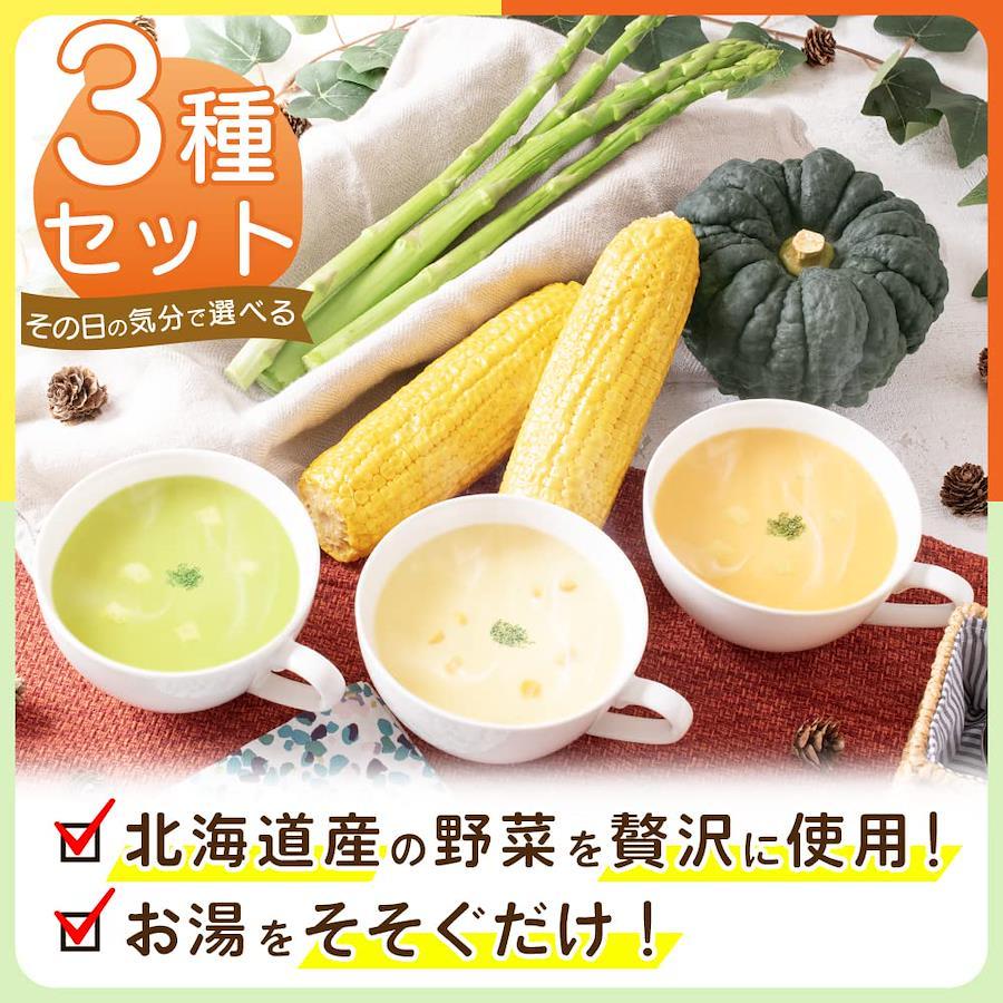【商品情報】北海道産の野菜を贅沢に使用した「かぼちゃスープ」「アスパラスープ」「コーンスープ」の3種アソートスープセットです。