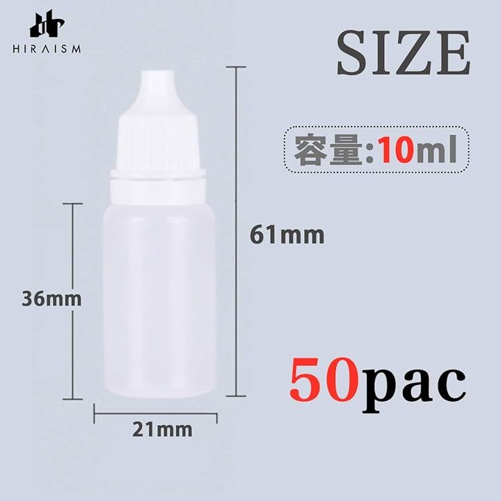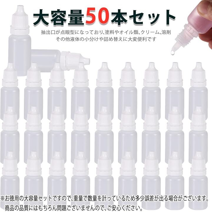「商品内容」ドロッパーボトル:50個入 付属:漏斗 容量:10ml 高さ:6.1cm ボトル径:2.1cm 口径:1cm 重量:3.6g / 個 カラー:半透明x白 素材:PE