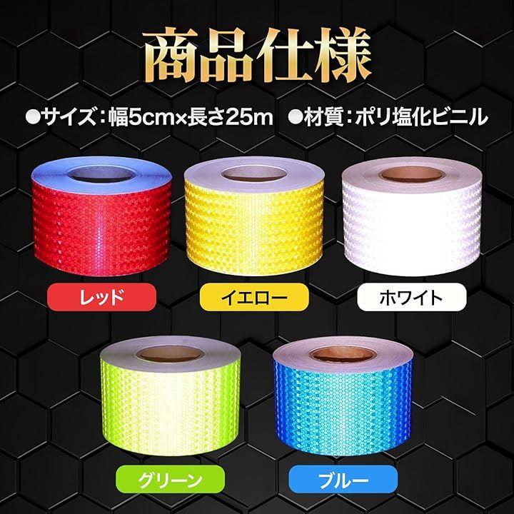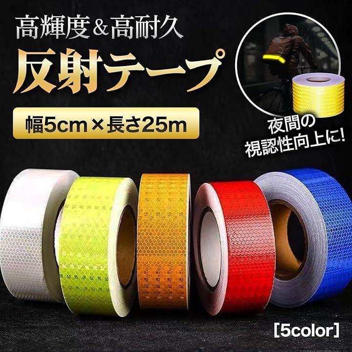 テープ長さ:約25m テープ幅:約5cm、素材:PVC、色:赤 レッド / 青 ブルー / 黄色 イエロー *高輝度反射テープは、暗闇でも強力な反射力を発揮し、夜間の安全性を確保します。