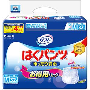 ■商品概要メーカー:リブドゥコーポレーション商品名:リフレ はくパンツ ゆったり安心 お得用パック Mサイズ(32枚入)区分:日用雑貨内容量:32枚入り商品概要:おしっこ約4回分吸収。ゆったりソフトギャザー採用でお肌にやさしくしっかりフィット!足まわり・お腹まわりを締め付けないのにスキマができにくく、さらに上げ下げカンタンに!お肌にやさしいやわらか柔軟仕上げ。全面通気性シート採用。股間スッキリ構造でモコモコしない。横モレ防止ギャザーが足まわりにフィットし尿をせき止めます。ブルーのライン付きだから尿パッドをつける位置も分かりやすい。消臭ポリマー配合。JANコード:4904585029868商品コード:117802737