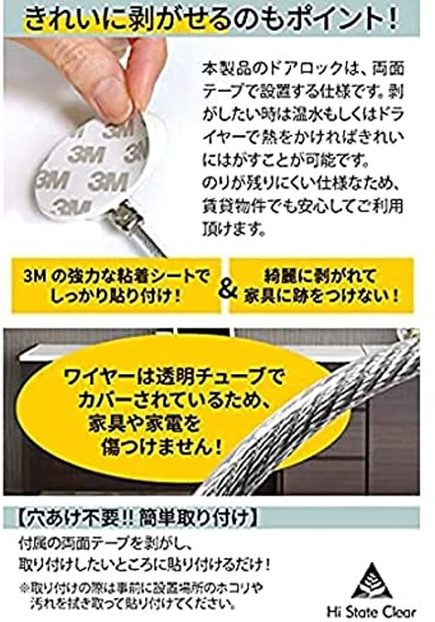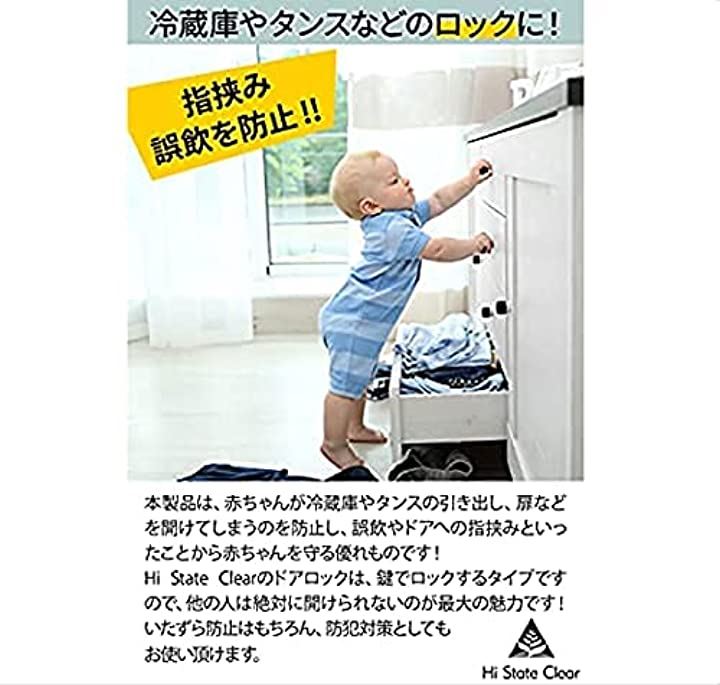鍵の役割になりますので、誤飲やドアへの指挟みといったことから要介護の方やお子様、障害のある方を守る優れものです。「Hi State Clear」製のドアロックは、鍵でロックするタイプのドアロックです。