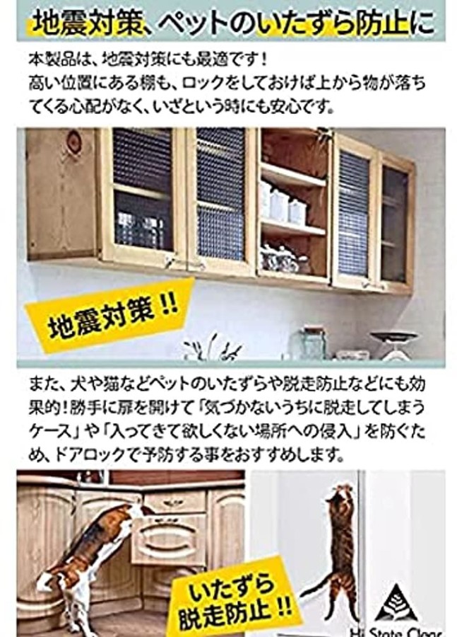 ・v3「 地震対策、ペットのいたずらにも。 」 本製品のドアロックは、地震対策にも最適です。大きな地震の際は、家具や冷蔵庫が倒れるだけでなく、扉が開いて中身が飛び出してくる事があります。