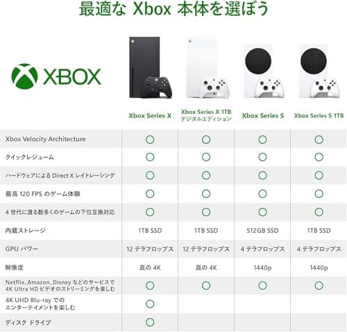 ■ Product Features: The 1TB Xbox Series S allows you to easily start the game. Simple robot white finish. A new generation of gaming environments equipped with Xbox Velocity Architecture. Quick resume and fast loading. HD games up to 120 fps Innovative compact design. This product does not come with a disk drive. Disc-edition games are not available. Included Items: Xbox Series S main unit (1 TB SSD built-in) Xbox wireless controller Ultra High Speed HDMI Cable Power cable 2 x AA batteries. [Refurbished] This product has been professionally inspected, tested, cleaned, and serviced as needed by certified refurbished Warranty time is 180 days. Detailed warranty details can be reviewed through the warranty terms and seller policy 1TB Xbox Series S with a simple robot white finish that allows you to easily start your game with the new generation of gaming environments featuring Xbox Velocity Architecture; quick resumes and fast loading; HD games up to 120 fps; Innovative compact design This product does not have a disk drive. Disc-edition games are not available Xbox Cloud Gaming is a service that allows you to play over 100 titles of Xbox games on your device with a controller that supports Xbox Game Pass Ultimate Simple robot white finish New generation of gaming environments with Xbox Velocity Architecture. Quick resume and fast loading Play HD games up to 120 fps (#lf)(#lf)(#lf)商品購入前に、ストア紹介ページをご確認ください。