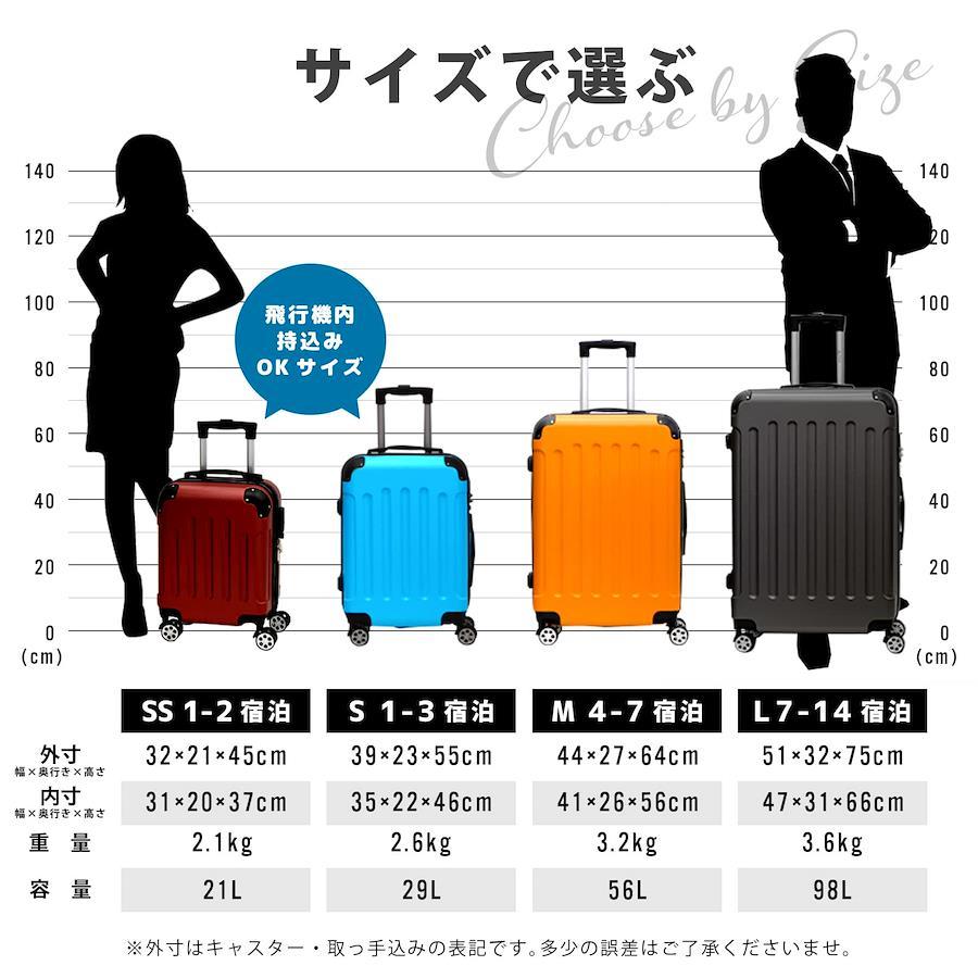 【女性でも持ち上げられる驚きの軽さ】RELUXYのスーツケースは2.1kg?の超軽量ボディで階段などでも持ち上げやすく、航空会社の重量規定内でより多くの荷物を持ち運べます。 【傷や汚れがつきにくい】表面がエンボス加工されているため傷や汚れが付きにくく目立ちません。空港で貼られるシールも剥がしやすいので、長くスーツケースを利用したい方におすすめです。 【軽いのに頑丈】ヘルメット等にも使用されているABS樹脂を使用しているので耐衝撃性にとても優れています。軽さと丈夫さの両立を実現しました。 【なめらかで安定感のあるダブルキャスター】大きいタイヤが2重になっているので安定感があり、タイヤの負荷が少ないので壊れにくい仕様です。360度回転で小回りがきくので方向転換も思いのまま。 【たっぷり入る使いやすい内装】内側は防水性に優れた素材が使用され、荷崩れ防止用の仕切板やクロスベルトも装備しています。メッシュポケットもあるので小物の整理にも便利です。