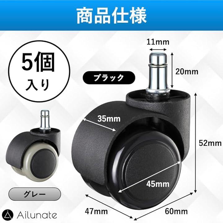 同梱数:キャスター5点、シャフト径:11mm、シャフト長:20mm、タイヤサイズ:45mm、カラー:ブラック、グレー