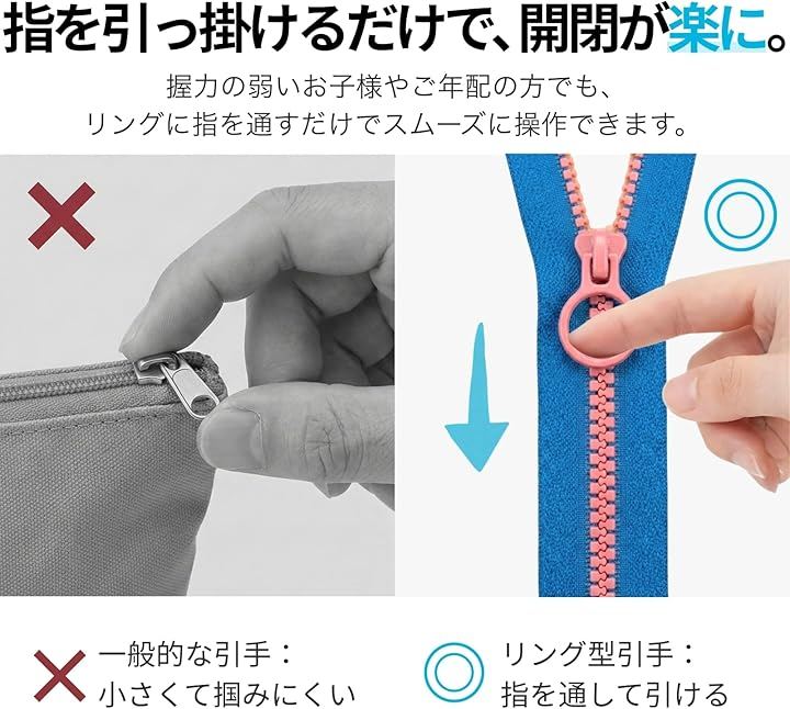 「指を掛けやすく開閉がスムーズなリング型引き手」 内径約2cmのリング形状をしたファスナースライダーを採用しています。