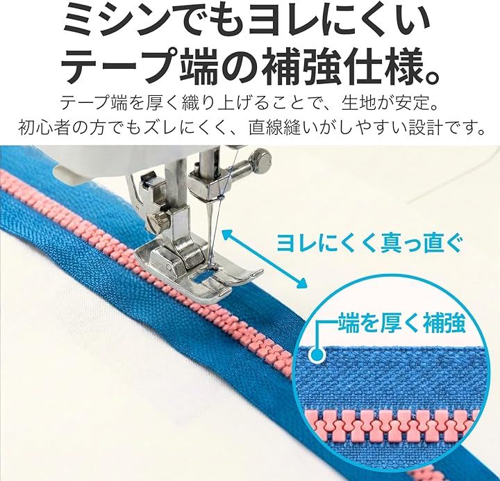 「縫い付けやすくヨレにくいテープ端の補強仕様」 ファスナーテープ(布)の端部分を厚く織り込み、強度を高めた設計に仕上げました。
