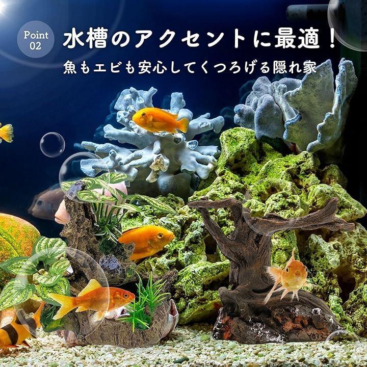 流木風の優雅な佇まいが、水中やテラリウムの中で鮮やかに映え、水生生物の隠れ家や登り台として活躍します。