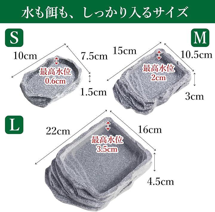 「サイズ」S:10x7.5x1.5cm 最高水位0.6cm M:15x10.5x3 最高水位2cm L:22x16x4.5 最高水位3.5cm 「素材」エポキシ樹脂(塗料・染料は不使用)