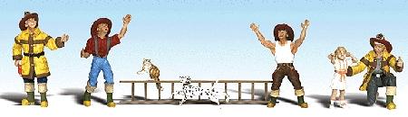 木に登って降りれなくなった猫を、ハシゴを使って救出中の消防士(レスキュー隊)と、それを見守る子供と犬の人形のセットです。