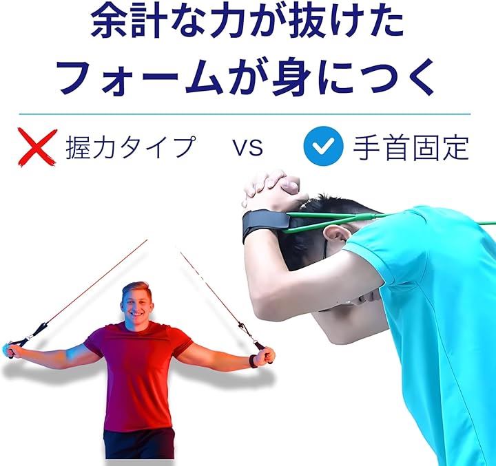 「肩・腕・体幹を効果的に鍛える秘密とは?」 手首に固定するタイプのトレーニングバンドなので、握力を使わずに背中や腕、体幹をしっかり鍛えることが可能です。