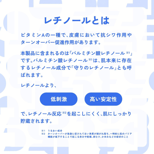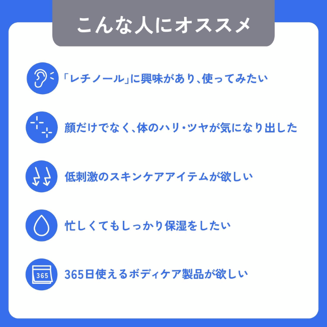 ●レチノール365ボディミルク、それは毎日使ってほしいレチノール※1。入浴後の全身のスキンケアに使えて、ハリ・ツヤを与え、みずみずしくなめらかな肌へ導くボディミルクです。●高保湿でしっとり、肌の乾燥も防いでくれる、伸びの良いミルクタイプ。使いやすいポンプ式。●無着色・無香料もうれしい。●パルミチン酸レチノール※1は、高い安定性で肌にしっかり貯蔵されます。※1うるおい成分